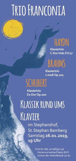 SCHWEINFURT (etv) Wieder einmal kam das Publikum im Foyer des Schweinfurter Theaters in den Genuss eines vollendeten Kammermusikabends: Das Klaviertrio Franconia schlug mit seinem Programm einen Bogen über 100 Jahre Klavierkammermusik, angefangen von der Kompositionskunst eines Joseph Haydn im ausgehenden 18. Jahrhundert (Klaviertrio C-Dur Hob XV:27) über den späten Franz Schubert (Klaviertrio Es-Dur op. 100) bis hin zum reifen Johannes Brahms (Klaviertrio c-Moll op. 101).
